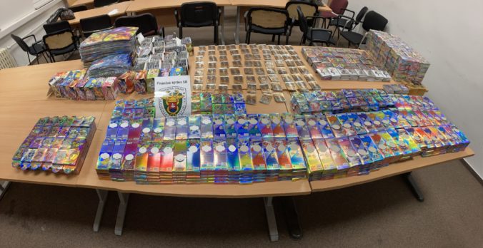 20.4.2023 (SITA.sk) - Bratislavskí colníci zaistili 3508 balíkov napodobenín zberateľských kartičiek Pokémon v hodnote viac ako 22-tisíc eur. Ako informovala hovorkyňa Colného úradu (CÚ) Bratislava Drahomíra Adamčíková, hliadka príslušníkov finančnej správy z CÚ Bratislava zasahovala v uplynulých dňoch v areáli na ulici Stará Vajnorská.Zamerali sa na kontrolu motorového vozidla so slovenskou poznávacou značkou, ktorého majiteľom bol 53-ročný občan čínskej národnosti. Colníci ho vyzvali, aby sprístupnil úložný priestor a interiér vozidla, kde sa nachádzali kartónové krabice.
