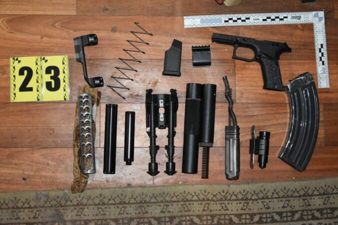 Medzi zakázanými zbraňami kategórie A sa nachádzali krátke palné zbrane pôvodne určené na expanzné alebo signálne strelivo, ktoré boli nelegálne upravené na ostrú streľbu. Policajti zaistili aj podomácky vyrobené alebo upravované zbrane bez identifikačných údajov, samostatné hlavné časti zbraní, ako sú hlavne, závery, telesá zbraní či valce revolverov, ktoré sú použiteľné pre zakázané zbrane. Súčasťou nálezu boli aj tlmiče hluku výstrelu, nelegálne upravené moderátory zvuku a kombinované zbrane zložené z viacerých častí rôznych zbraní, upravené neodborným spôsobom.
