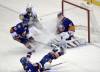 Brankár tímu Európy Slovák Jaroslav Halák (vpravo) v súboji o puk so švédskym obrancom Victorom Hedmanom v prípravnom zápase na Svetový pohár v hokeji 2016 Európa - Švédsko vo Washingtone 14. septembra 2016. FOTO TASR/AP
