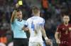Na snímke hlavný rozhodca Damir Skomina zo Slovinska ukazuje žltú kartu slovenskému obrancovi Jánovi Ďuricovi (uprostred) v zápase B-skupiny na majstrovstvách Európy 2016 vo futbale medzi Ruskom a Slovenskom v stredu 15. júna 2016 vo ...