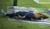 Argentínsky hráč Angel di Maria leží na trávniku po tom, ako sa zranil vo futbalovom zápase štvrťfinále Argentína - Belgicko