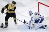Na snímke hráč Boston Bruins David Pastrnak a brankár tímu Toronto Maple Leafs Michael Hutchinson.