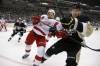 Na ilustračnej fotografii hráč tučniakov Blake Comeau pred zrážkou v rohu klziska s Niklasom Kronwallom z Detroit Red Wings.
