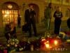 Ľudia postávajú nad horiacimi sviečkami a kyticami kvetov, položenými pred budovou vlády v Štokholme.