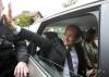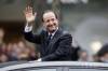 Nový francúzsky prezident Francois Hollande máva v daždi z auta počas jazdy po Champs Elysees po jeho inaugurácii v Elyzejskom paláci v Paríži 15. mája 2012.