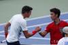 Kanaďan Miloš Raonič si podáva ruku s Japoncom Juičim Sugitom, 18. augusta 2016.