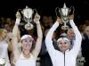 Švajčiarka Martina Hingisová (vľavo) a Indka Sania Mirzaová (vpravo) s trofejami nad hlavou oslavujú víťazstvo v zápase proti ruskému páru Jekaterina Makarovová, Jelena Vesninová vo finále štvorhry žien na grandslamovom turnaji vo ...