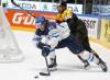 Brankár tímu Európy Slovák Jaroslav Halák (vpravo) v súboji o puk so švédskym obrancom Victorom Hedmanom v prípravnom zápase na Svetový pohár v hokeji 2016 Európa - Švédsko vo Washingtone 14. septembra 2016. FOTO TASR/AP