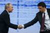 Ruský prezident Vladimir Putin (vľavo) a taliansky premiér Matteo Renzi (vpravo) si podávajú ruky počas stretnutia na Medzinárodnom ekonomickom fóre v Petrohrade 17. júna 2016.