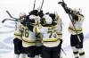 Brankár Boston Bruins Tuukka Rask oslavuje so spoluhráčom Johnom Mooreom, archívna snímka.