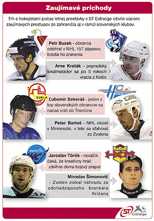 Č. Budějovíc, Šatan (ú) do NY Islanders, Bartek a Kapuš (ú) obaja do Novokuznecka, Hudec (ú) do Č. Budějovíc, Kokavec a Školiak (ú) do Skalice.