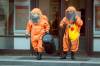 Hasiči v protichemických oblekoch uzatvorili prášok do suda ...