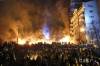 Ukrajinskí demonštranti stoja na barikáde, v pozadí dym a plamene, počas zrážok s políciou v centre Kyjeva 25. januára 2014.