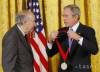 Na archívnej snímke bývalý americký prezident odovzdáva medailu historikovi Richardovi Pipesovi.