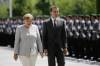Nemecká kancelárka Angela Merkelová a rakúsky kancelár Christian Kern počas prehliadky čestnej stráže v Berlíne 23. júna 2016.