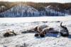 Na snímke uhynuté zvieratá ležia na snehom pokrytom území na severe Mongolska 13. februára 2017.