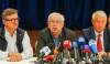 Sprava generálny tajomník Rady Európy Thorbjorn Jagland, osobitný vyslanec ruského prezidenta Vladimir Lukin a guvernér Doneckej oblasti Serhij Taruta počas tlačovej konferencie v Donecku 3. mája 2014.