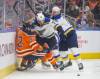 Justin Faulk (72) z Louis Blues odtláča hráča Edmonton Oilers Tomáša Jurča (92) od puku, vedľa je Jay Bouwmeester (19) z Blues.