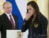 Na snímke vpravo ruská skokanka o žrdi Jelena Isinbajevová potláča dojatie počas olympijského sľubu ruskému prezidentovi Vladimirovi Putinovi (vľavo) pred odchodom na OH 2016 do Rio de Janeira v Moskve 27. júla 2016.