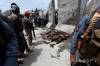 Afganské bezpečnostné sily hliadkujú pred mŕtvymi telami talibanských bojovníkov po kolízii pred budovou parlamentu v Kábule 22. júna 2015.Sebevražedný útočník se odpálil v blízkosti afganského parlamentu a niekoľko bojovníkov ...