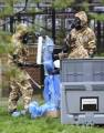 Príslušníci vojenských síl pracujú na dodávke v anglickom meste Winterslow 12. marca 2018 v súvislosti s vyšetrovaním prípadu otravy bývalého ruského špióna Sergeja Skripaľa a jeho dcéry, ktorých našli otrávených v anglickom ...