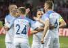 Na archívnej snímke radosť slovenských hráčov zľava Boris Sekulič, Erik Pačinda, Stanislav Lobotka a Ján Greguš.