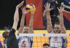 Na snímke spravo Peter Ondrovič, Juraj Zaťko (Slovensko) a Sam Deroo (Belgicko) v zápase B-skupiny na ME vo volejbale mužov Slovensko - Belgicko v Antverpách 17. septembra 2019.