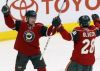 Z hokejovej KHL HC Slovan Bratislava - Dinamo Minsk 26. februára 2014 v Bratislave. Na snímke vpravo strelec gólu Branko Radivojevič a Peter Ölvecký sa radujú z úvodného gólu.