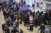 Cestujúci stoja v rade v hale letiska v Ženeve 1. marca 2018, ktoré pre silné sneženie čiastočne uzavreli. Vo Švajčiarsku v týchto dňoch pretrváva mrazivé počasie s teplotami pod bodom mrazu.