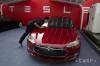 Ilustračné foto. Zamestnanec leští kapotu elektrického sedanu Tesla Model S americkej automobilky Tesla Motors