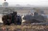 Tureckí vojaci hliadkujú na obrnených transportéroch rozmiestnených pri hranici so Sýriou, kde prebiehajú intenzívne boje medzi sýrskymi Kurdmi a militantmi Islamského štátu v Mursitpinare pri tureckom meste Suruc 7. októbra 2014. ...