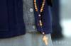 Na snímke z 22.marca 1999 ruženec visí na polici s ľudskými lebkami Rwanďanov, zabitých počas genocídy v r.1994, v priestoroch pamätníku genocídy zriadenom v katolíckom kostole v rwandskej Nyamate.