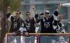 Hokejisti Los Angeles Kings, zľava Trevor Lewis, Brad Richardson a Jarret Stoll, mávajú na archívnej sníme fanúšikom, keď v autobuse prechádzajú v kolóne zaplnenými ulicami Los Angeles 14. júna 2012. Zisk svojho prvého Stanleyho ...