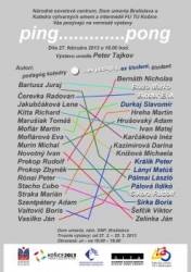 MINISTERSTVO KULTÚRY SR NÁRODNÉ OSVETOVÉ CENTRUM KATEDRA VÝTVARNÝCH UMENÍ A INTERMÉDIÍ FU TU KOŠICE Vás pozývajú na vernisáž výstavy PING – PONG v stredu, 27.2.2013 o 18,00 hod. Národné osvetové centrum, Dom umenia, Námestie SNP 12, Bratislava.