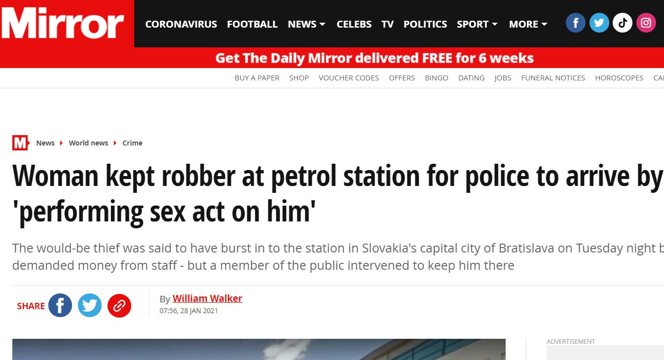 O žene z bratislavskej pumpy sa dokonca zmienil aj slávny portál mirror.co.uk. Ten zaujal takýmto titulkom: "Žena zdržala lúpežníka na benzínovej stanici, kým dorazila polícia - a to vykonaním sexuálneho aktu s ním“.