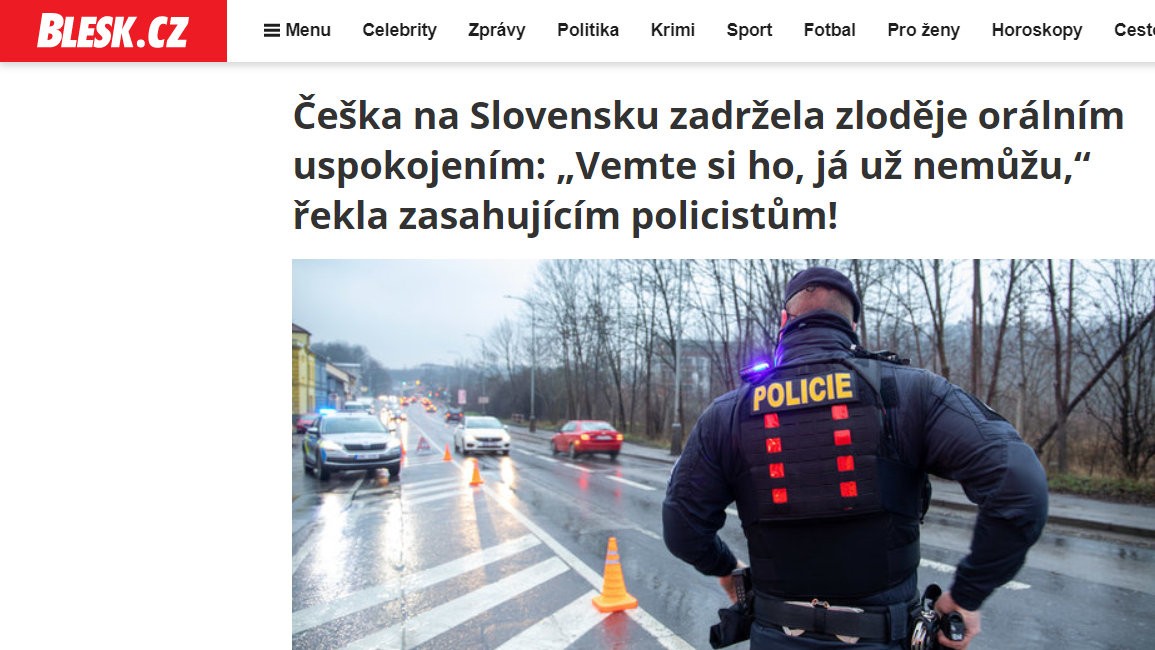 Poriadne pútavým titulkom zaujal portál blesk.cz. Ten vypichol ženinu medializovanú vetu, ktorou privítala zasahujúcich policajtov - "Češka na Slovensku zdržala zlodeja orálnym uspokojením: "Zoberte si ho, ja už nevládzem," povedala policajtom!